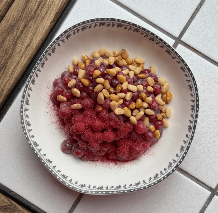 • Десерт «Таёжный»: брусника, сгущённое молоко, кедровые орехи, малиновая пудра 440₽