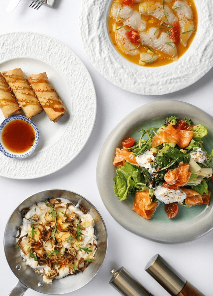 Мы отобрали из прошлого меню самые востребованные блюда,, сочетающие в себе кавказскую и паназиатскую кухни: спринг-роллы с рваной телятиной и салат с лососем в манговой заправке.